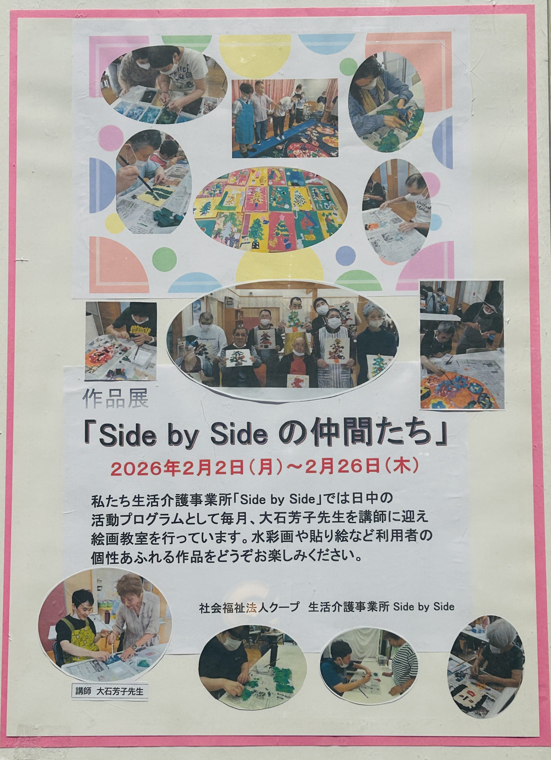 2025年2月2日(月)から26日(木)までの期間、当館の画廊喫茶レジェでは、生活介護事業所「Side by Side」(社会福祉法人クープ)の皆さんによる作品展を開催しています。最終日は16:30までの公開です。